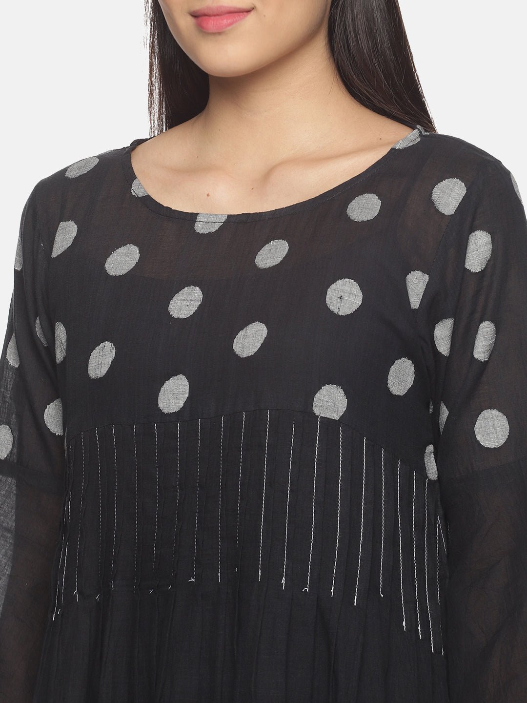 Infused with white Jamdani polka motifs on the upper part of the black fabric.?