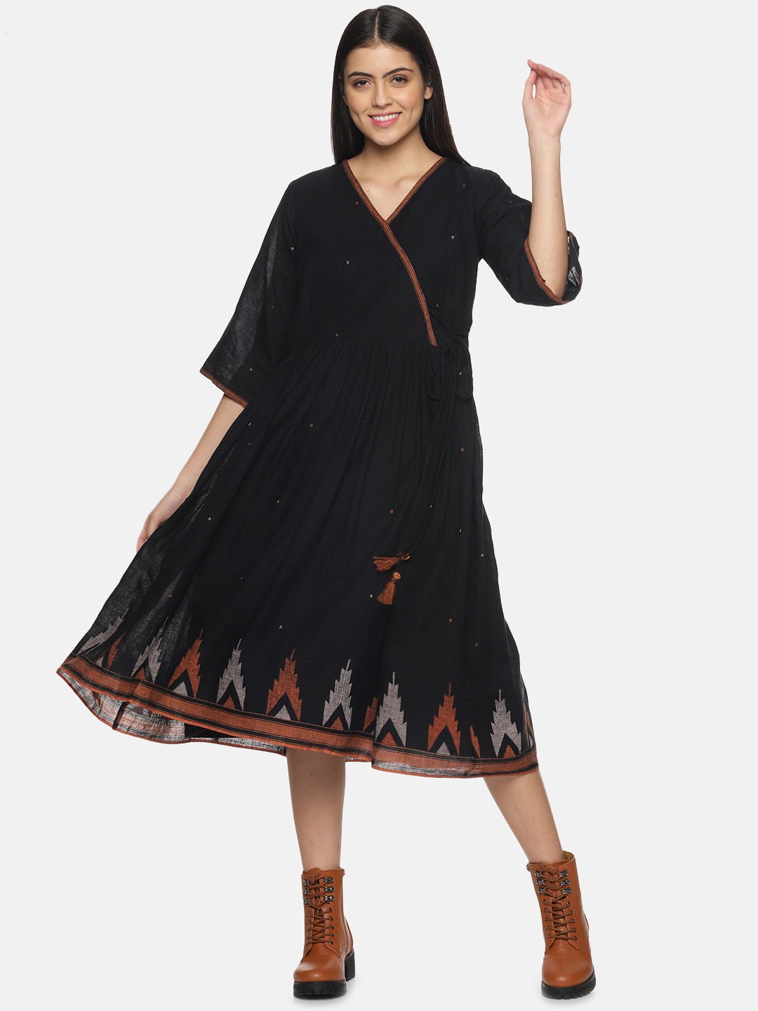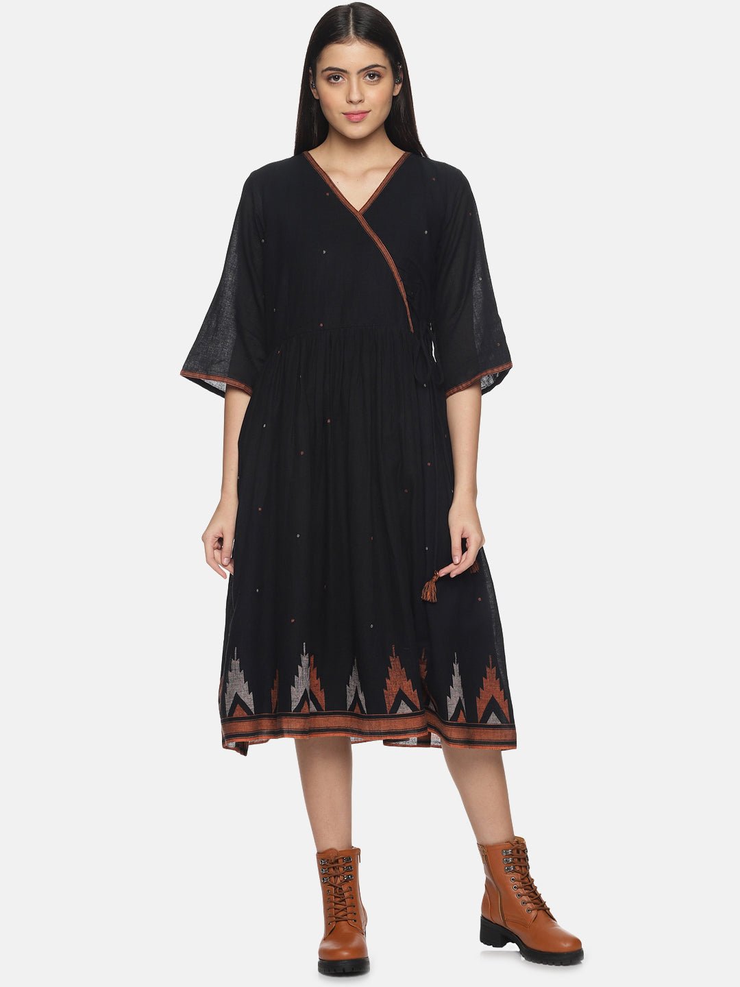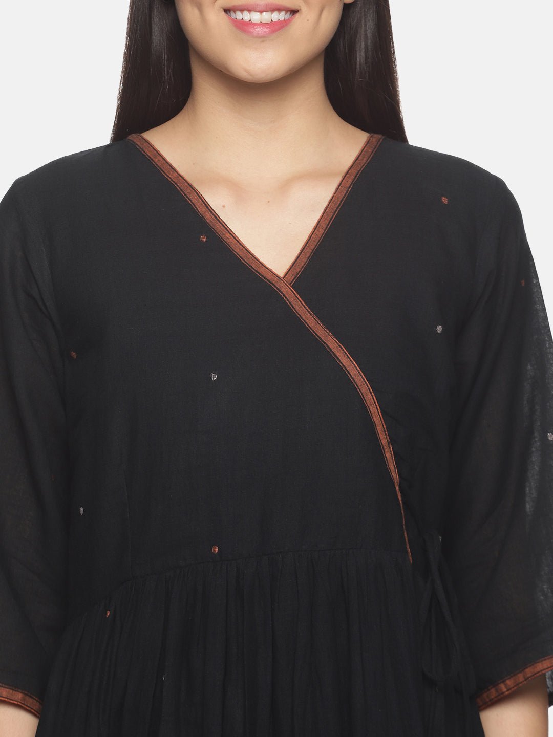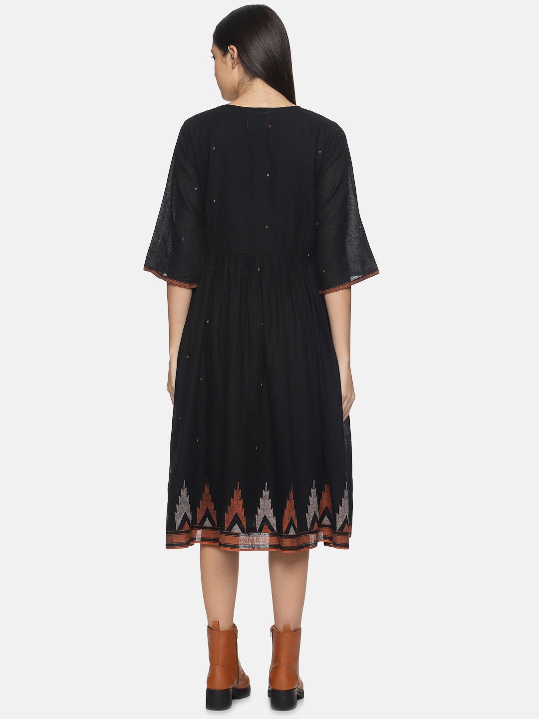 Black with orange border Jamdani Gather Dress