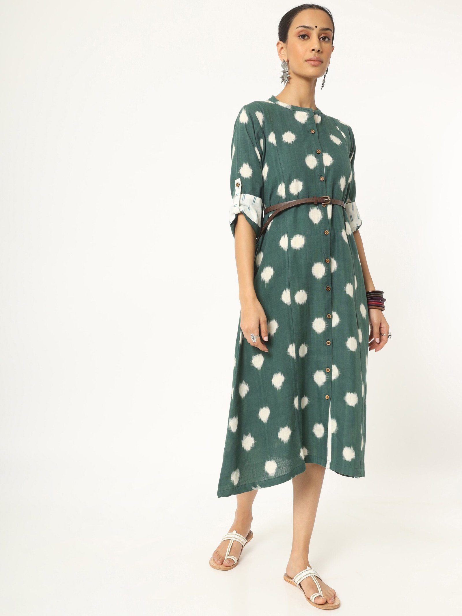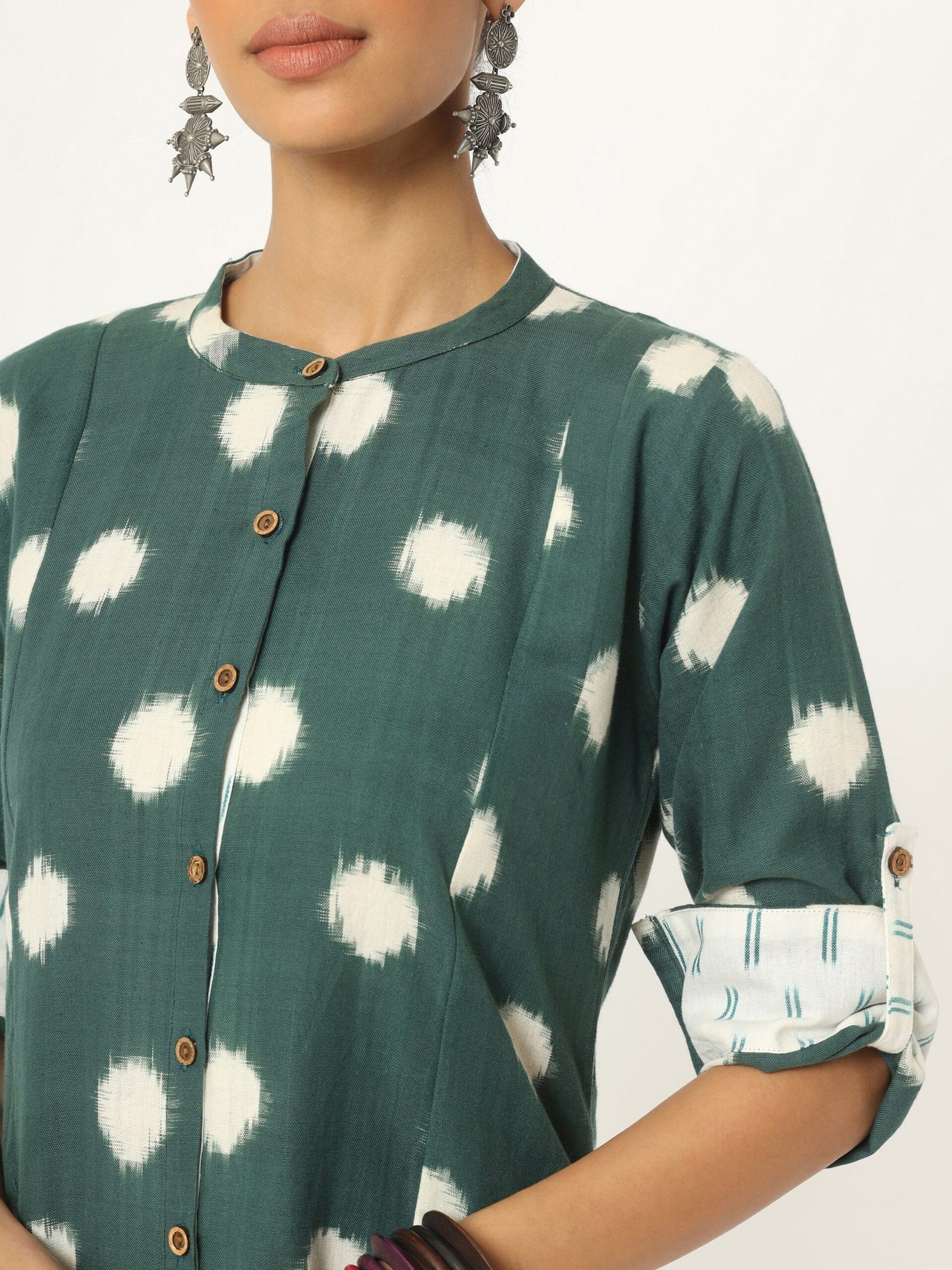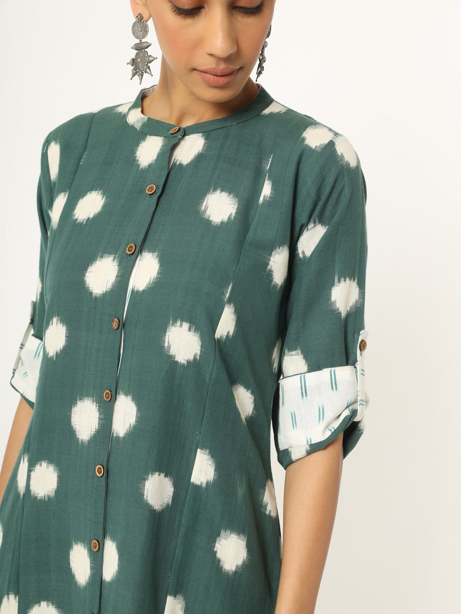 ?Fine hand-loom double Ikat fabric styles into a beautiful knee-length. A line dress. Wear this minimal Ikat design dress anytime anywhere and look your best. The bottle green pure cotton fabric has white motifs all over the body. The dress has a classic round neckline and front open with wooden button details making it simple yet fabulous.The three-quarters sleeve has a patch of a different fabric at the end. All together the dress is soft and light assuring all day comfort.