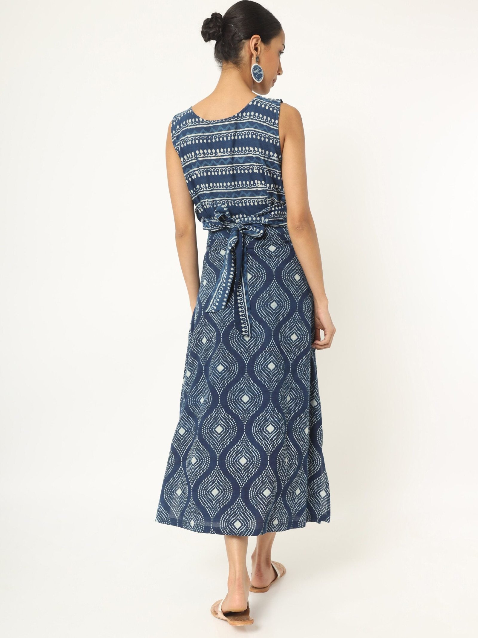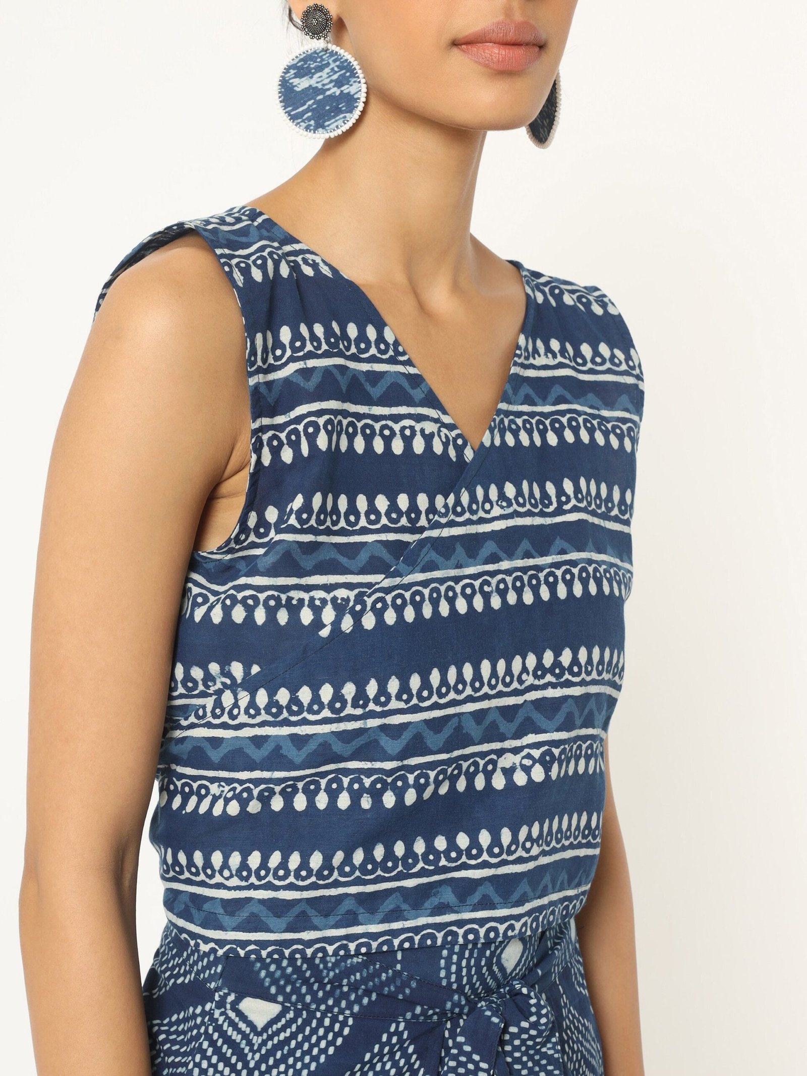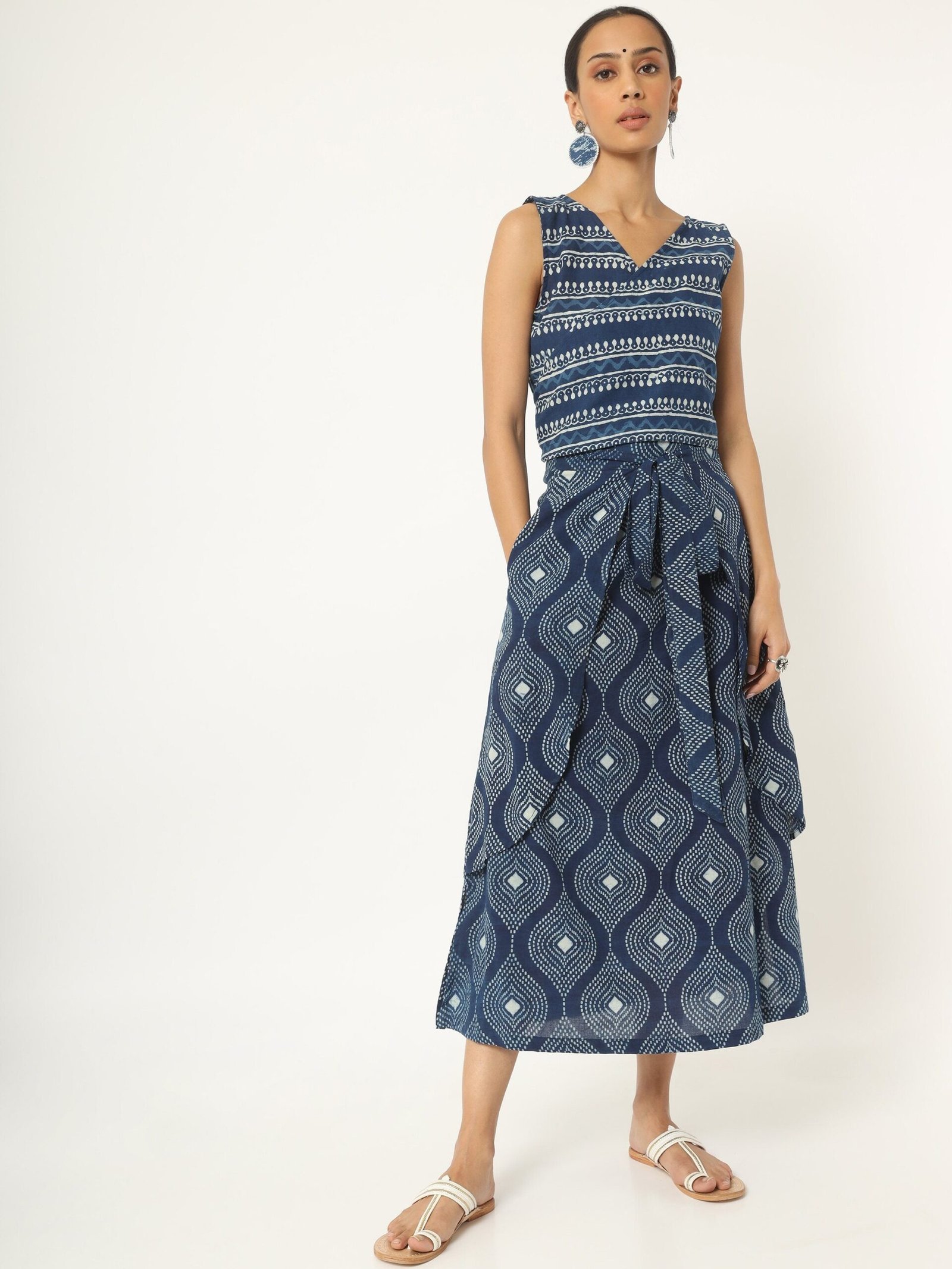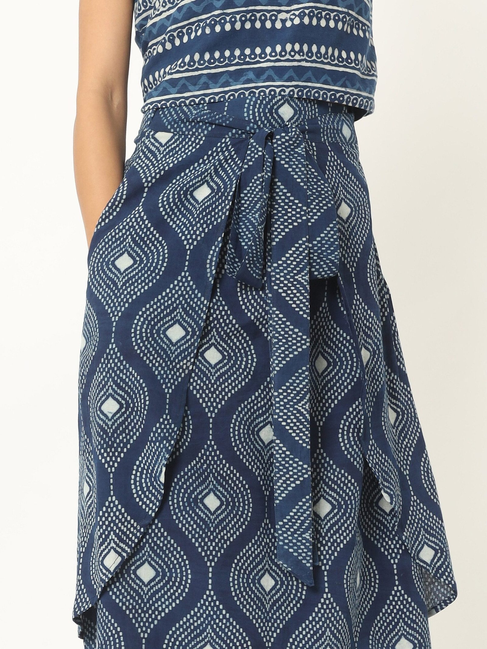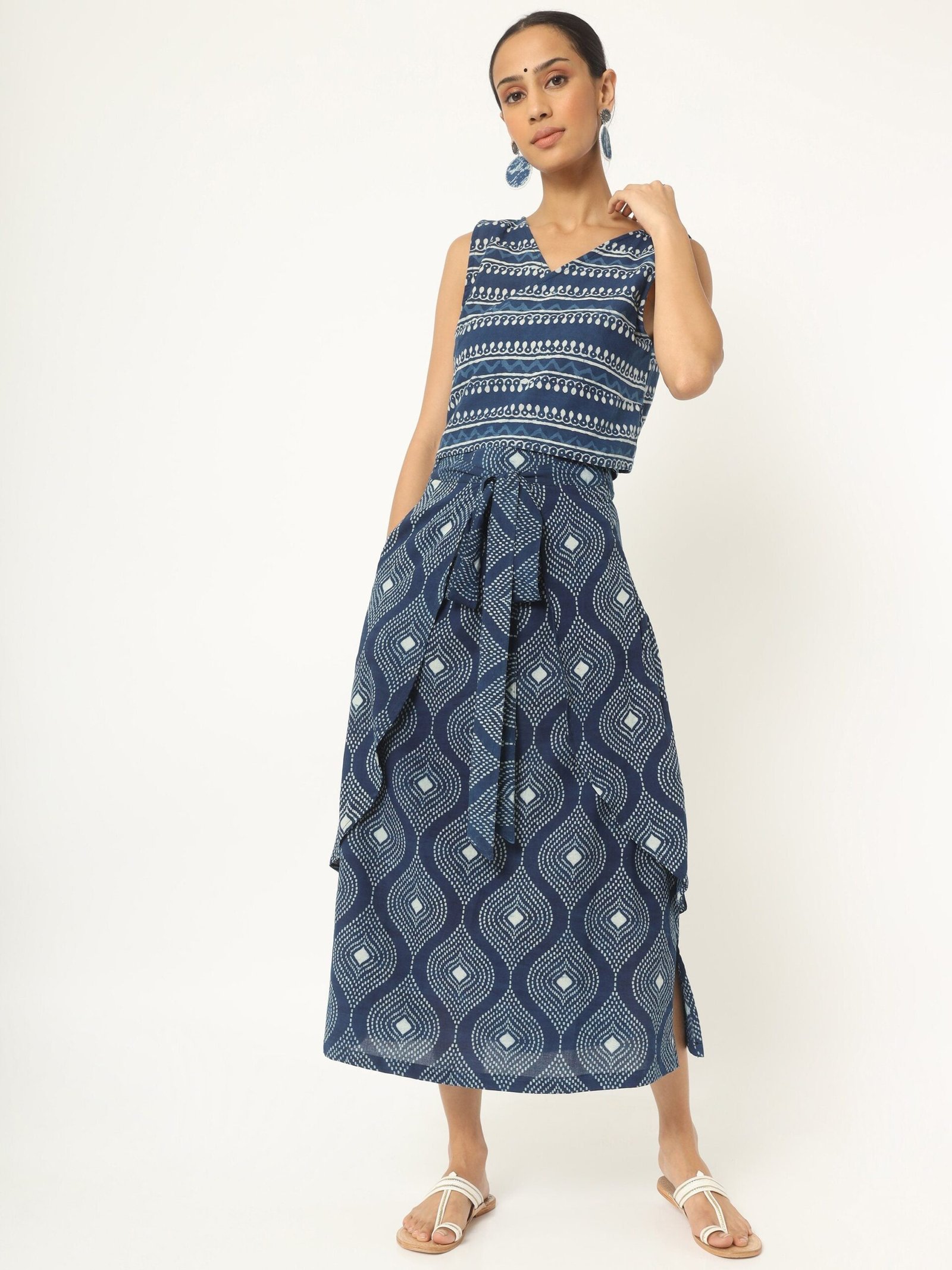 Feel easy-breezy in our Indigo hand block print skirt & top set. In an exclusive blue hued print featuring authentic kolka work made with pure breathable cotton fabric. You’ll love how the wrap around. sleeveless top is infused with white stripes and kolka motifs. With a darling draped skirt.hand block printed all over. The length falls few inches above the ankle comes along an overlapping pannel with belt for extra appeal. Style this with your nude wedges and a sling bag to steal the spotlight.
