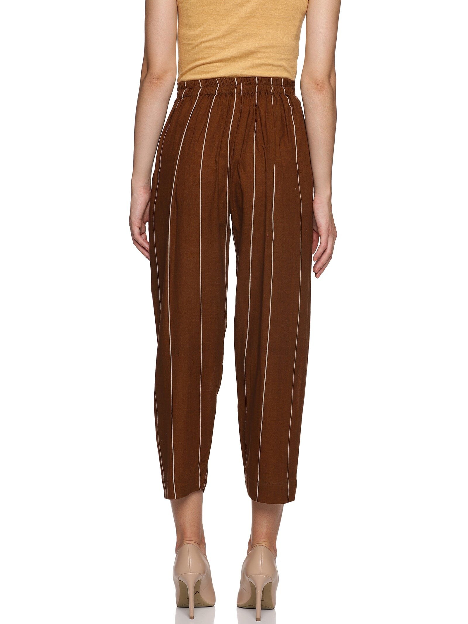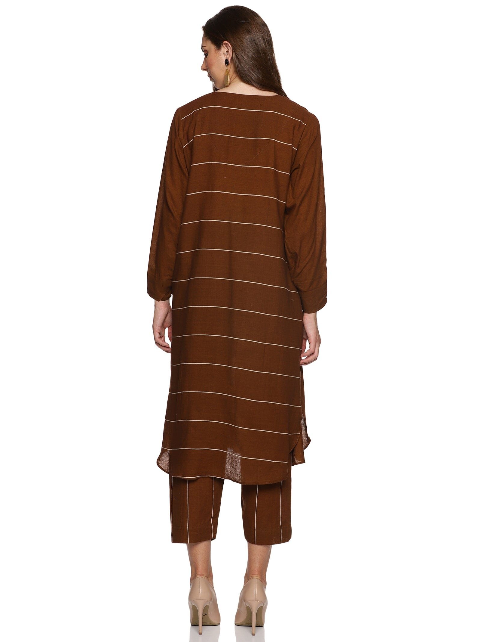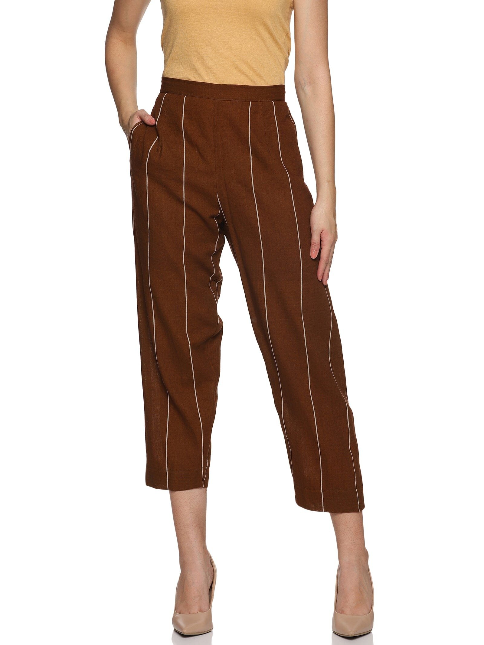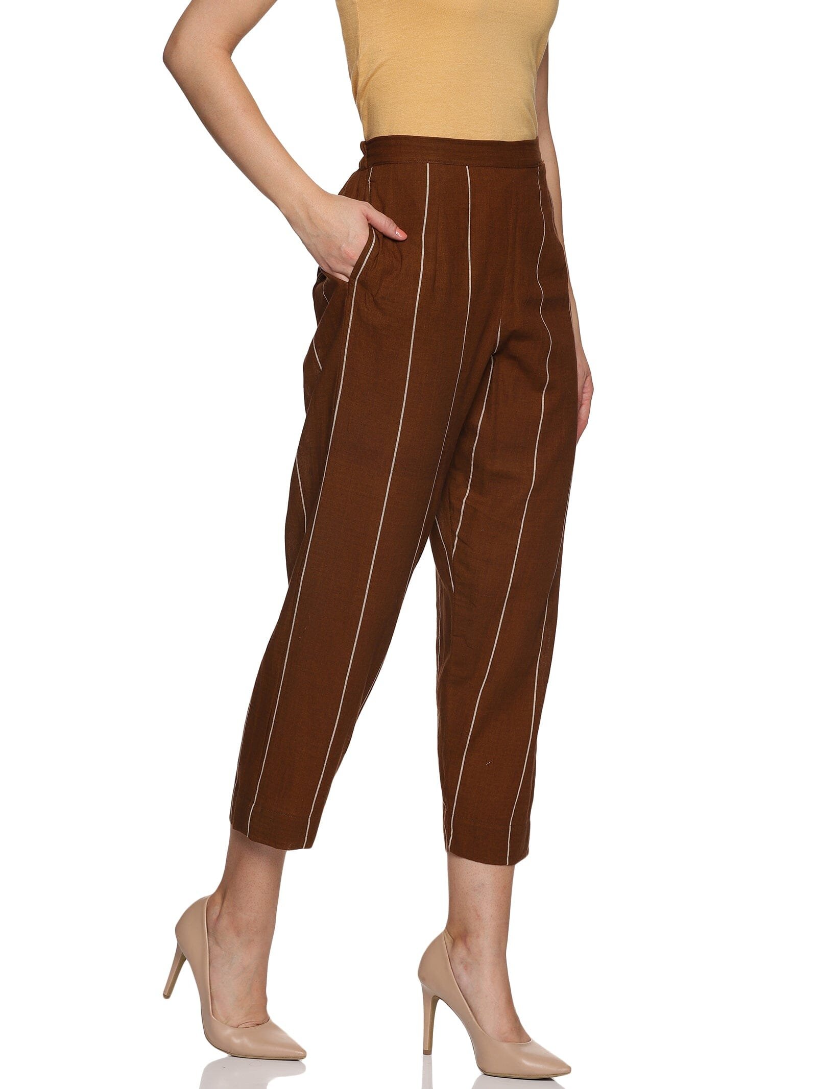 Comes with a pair of straight cut hand-loom cropped trousers in the colour coffee brown infused with vertical white stripes.