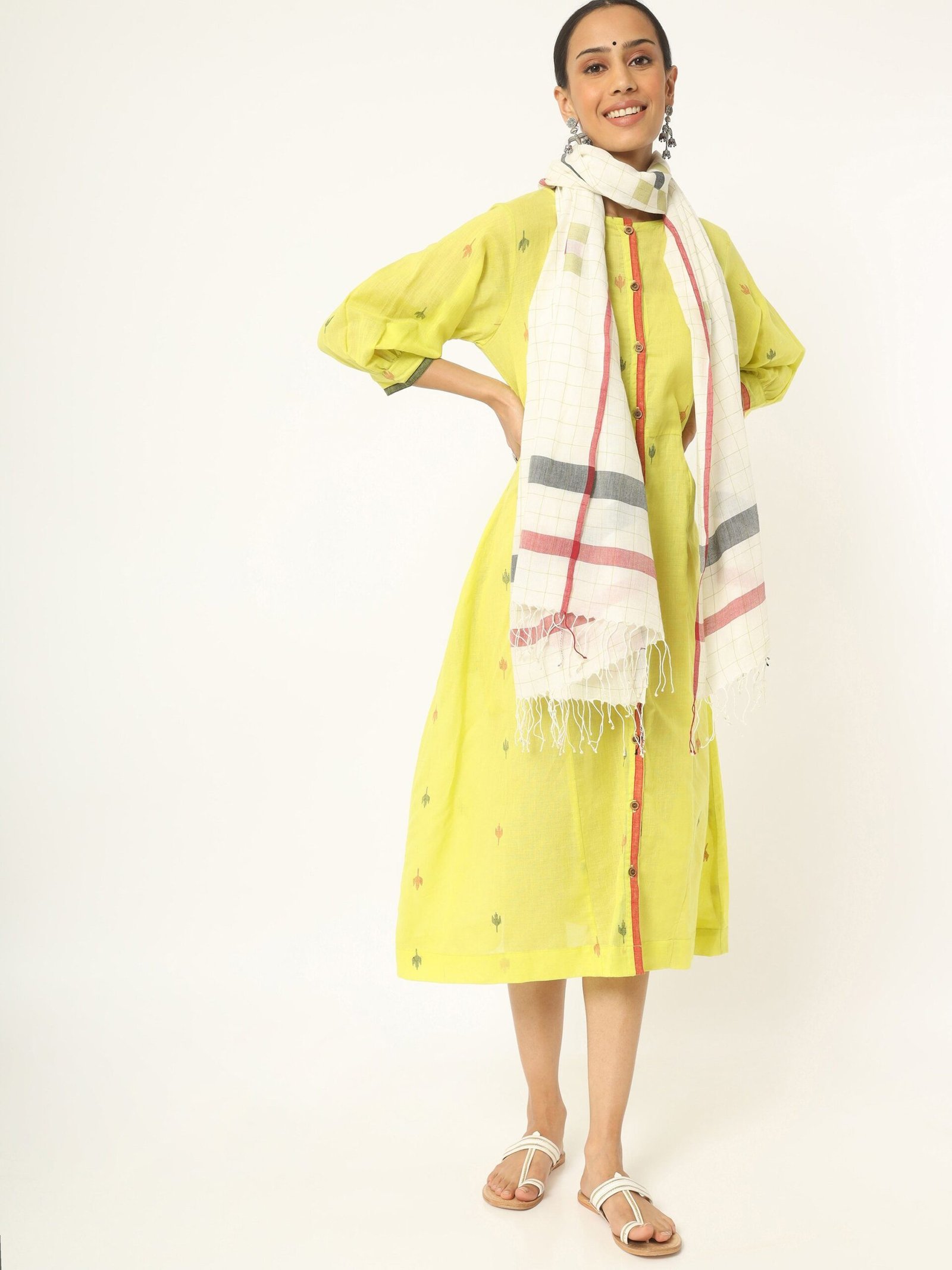 We’re bringing you soft Muslin Jamdani Dress in lemon yellow with red and black handwoven lotus motifs. Perfect to light up your special evenings and look radiant as ever. The styled three-Q gathered sleeves compliments the round neckline. The kurti is front open with wooden buttons featuring red and black borders in the front and sleeves. Team up this beauty with your heavy jhumkas and look picture perfect.