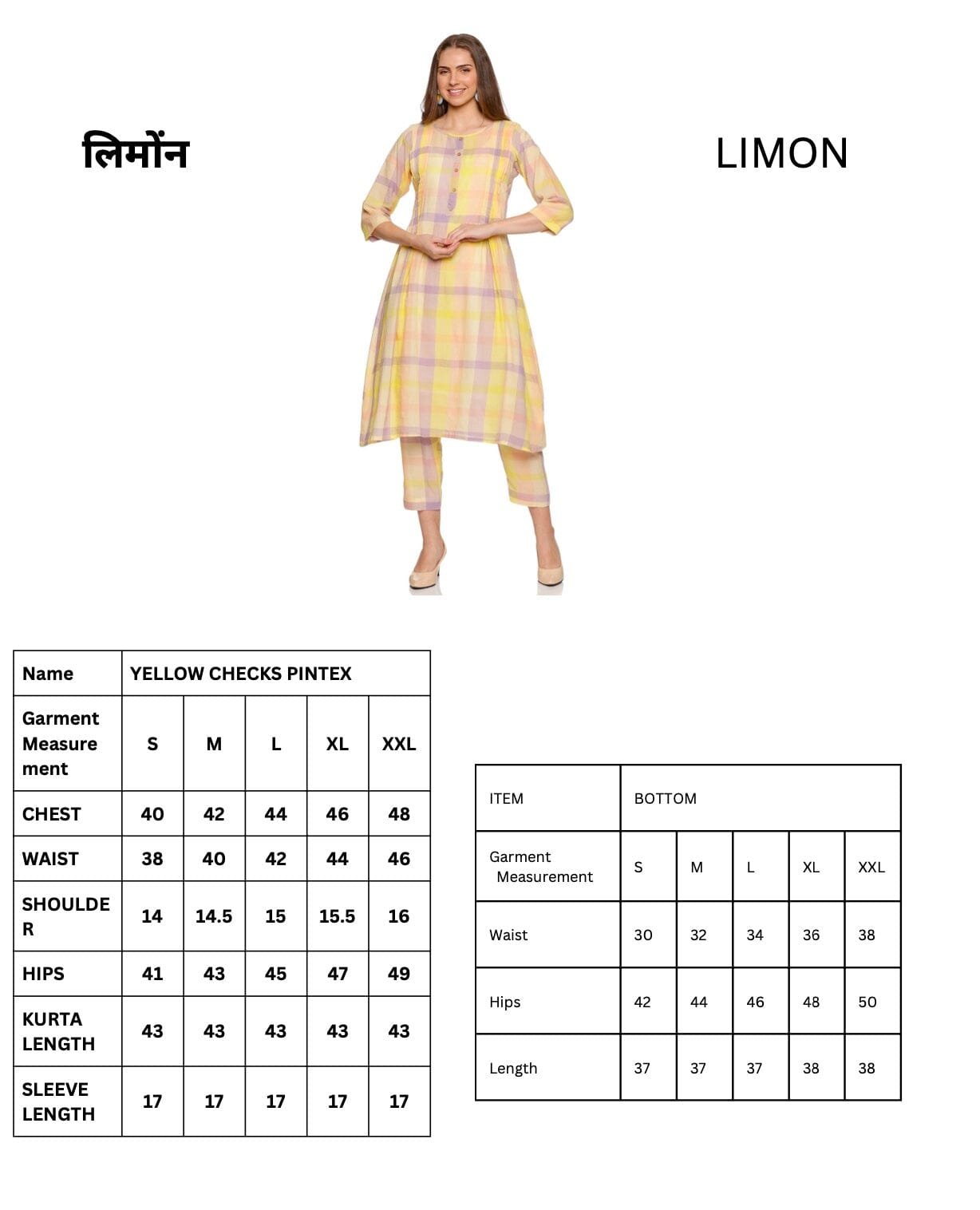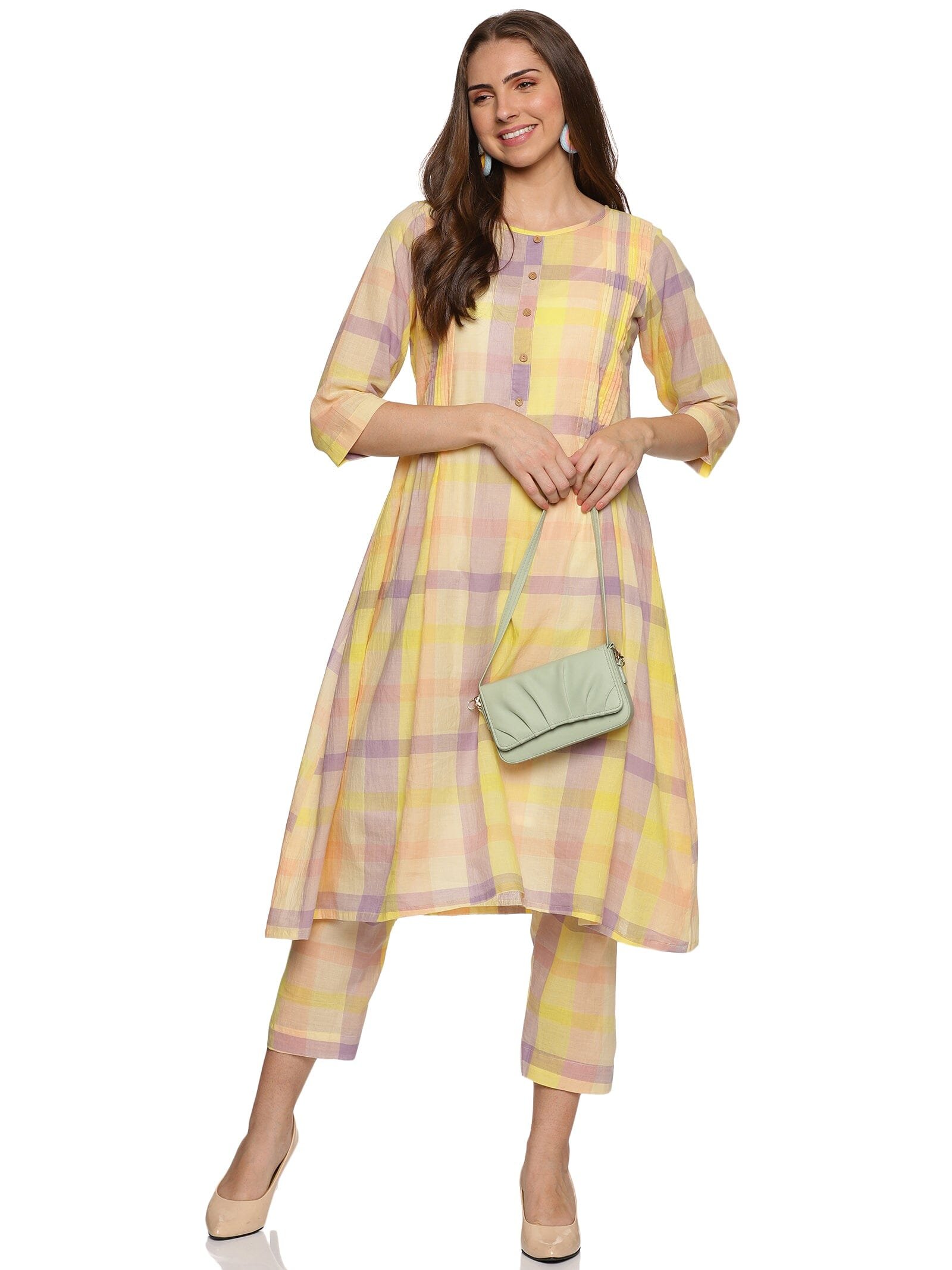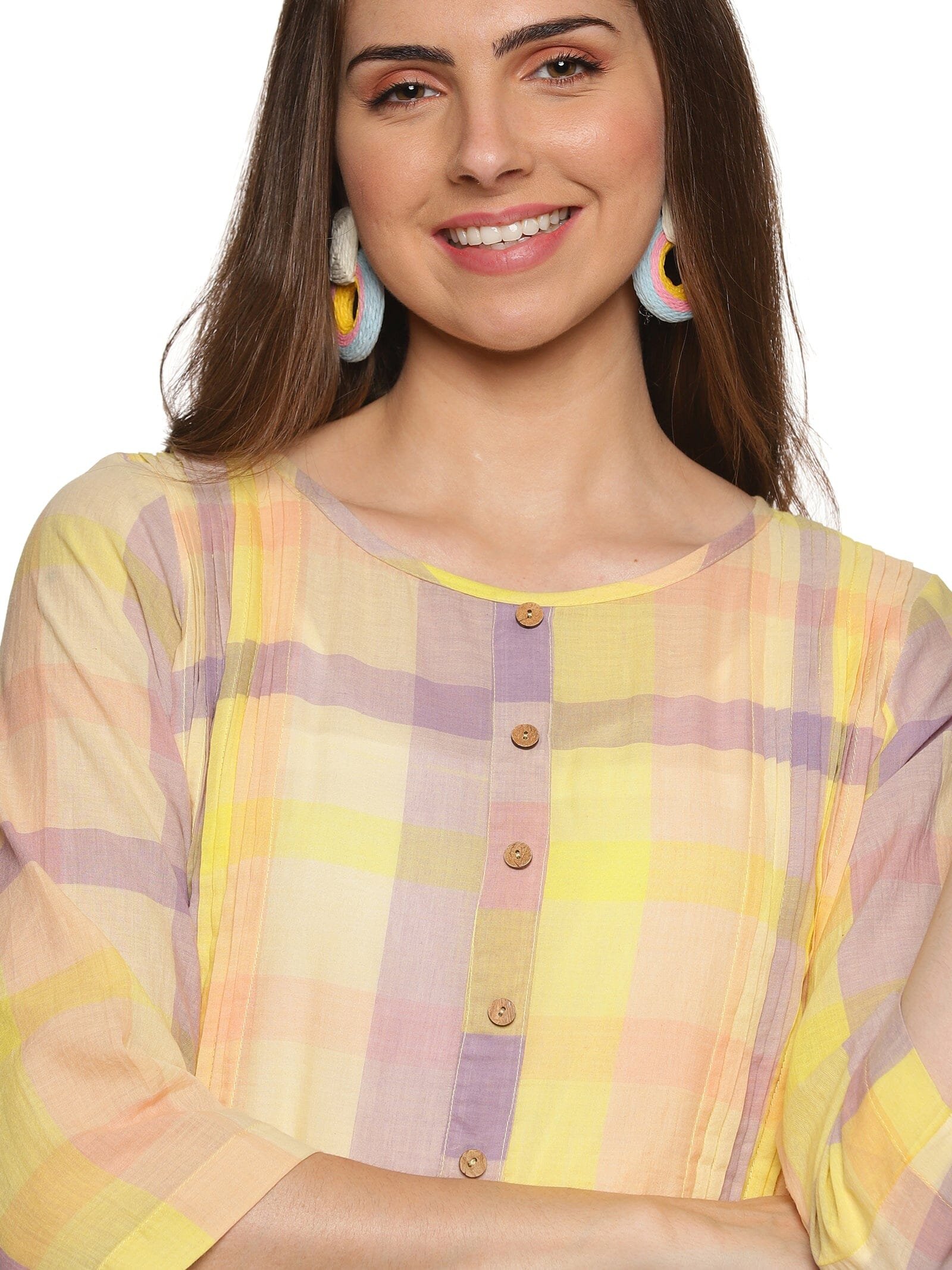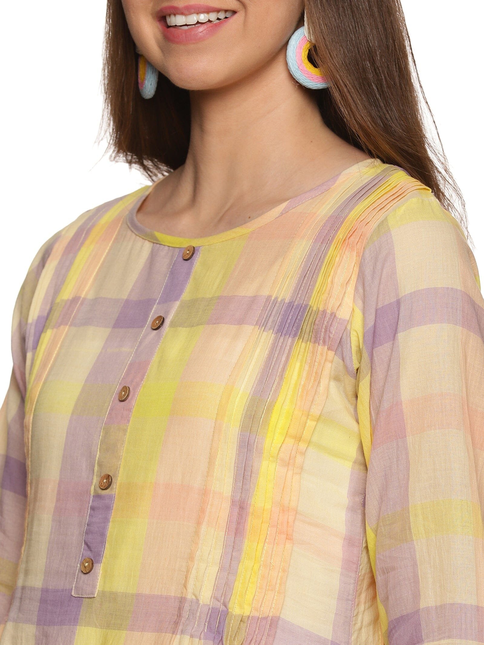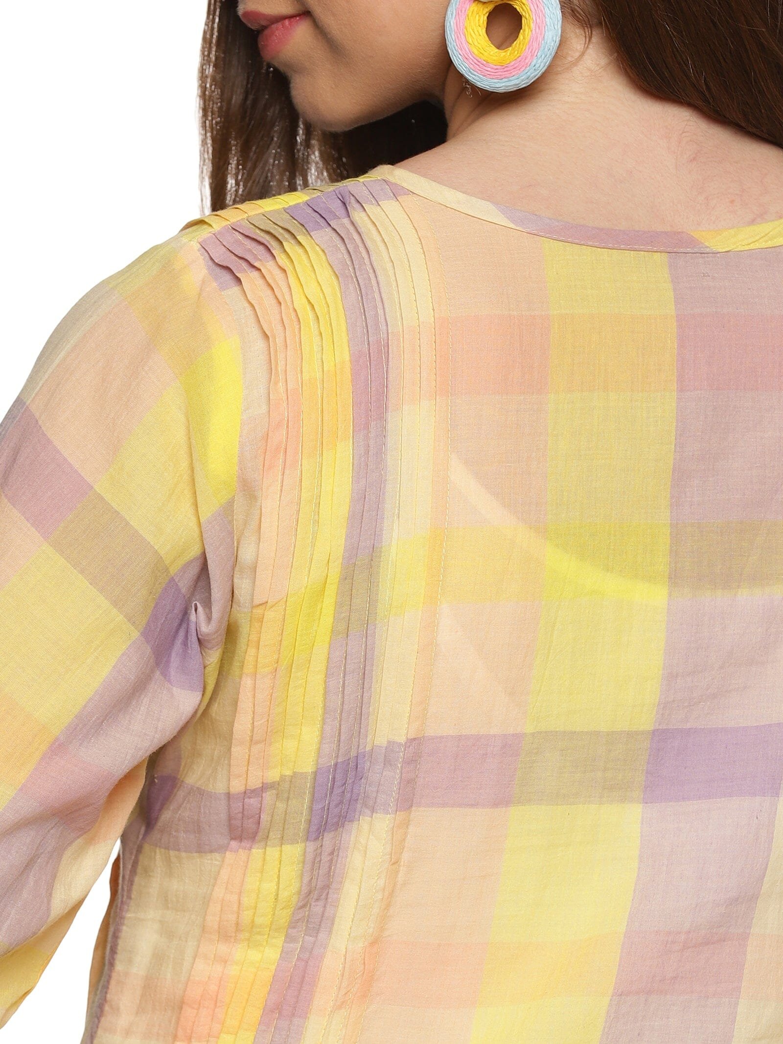 ?This adorable kurti is in a checked combination of lemon yellow. lavender and peach. giving it a very bright look and feel.