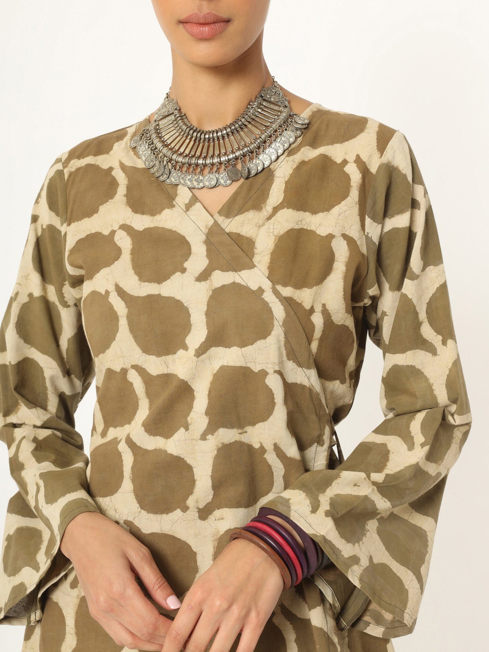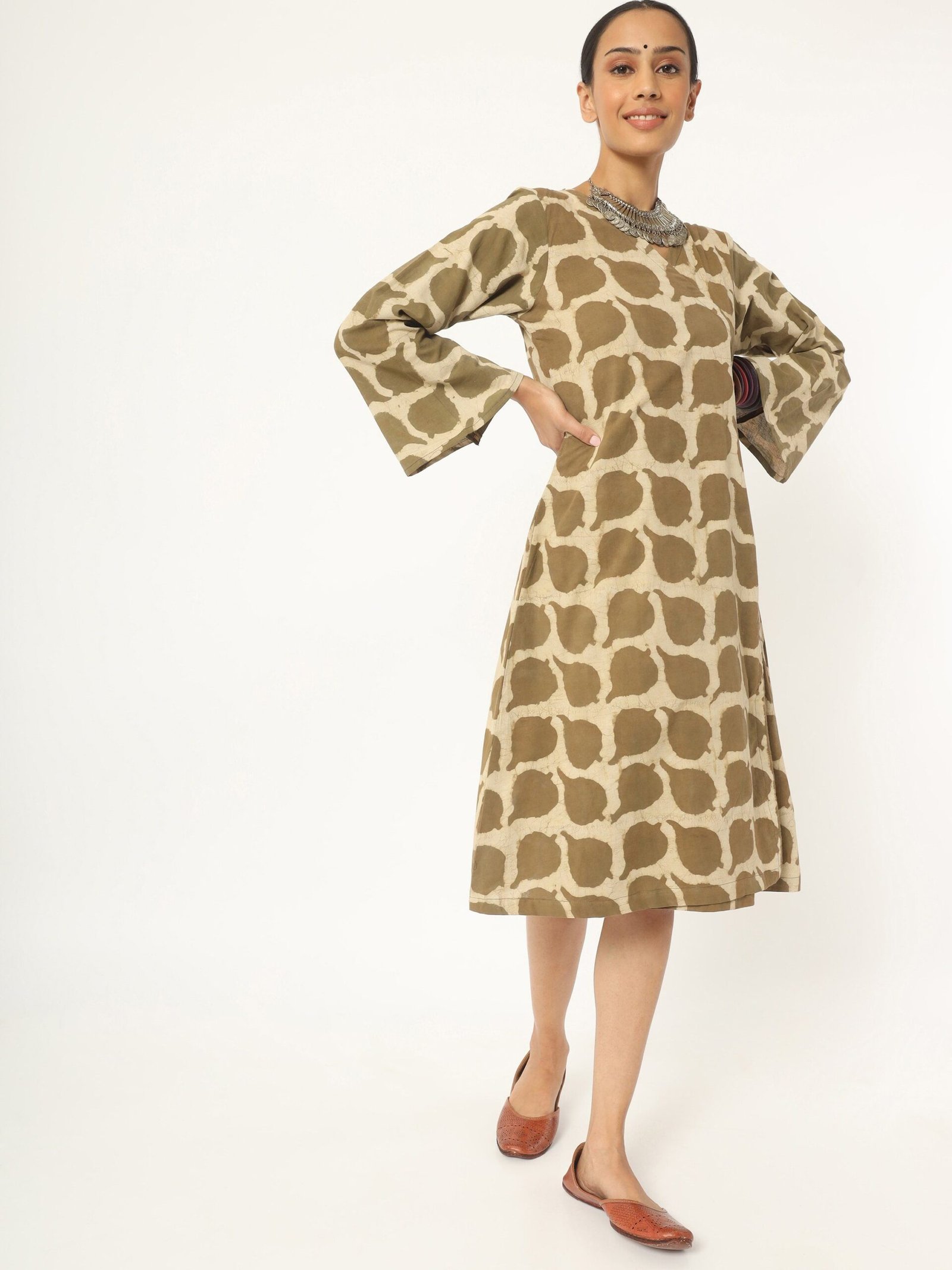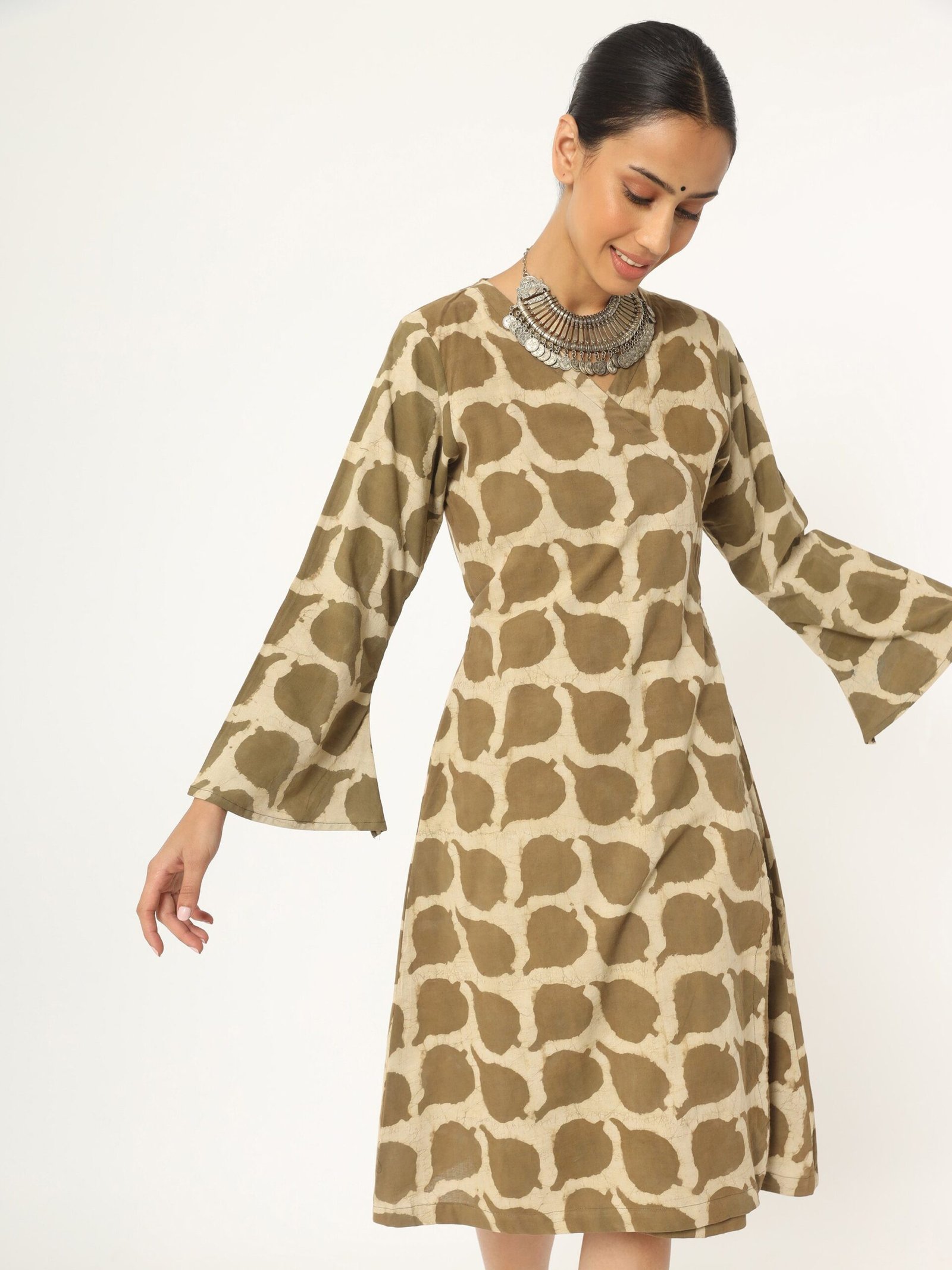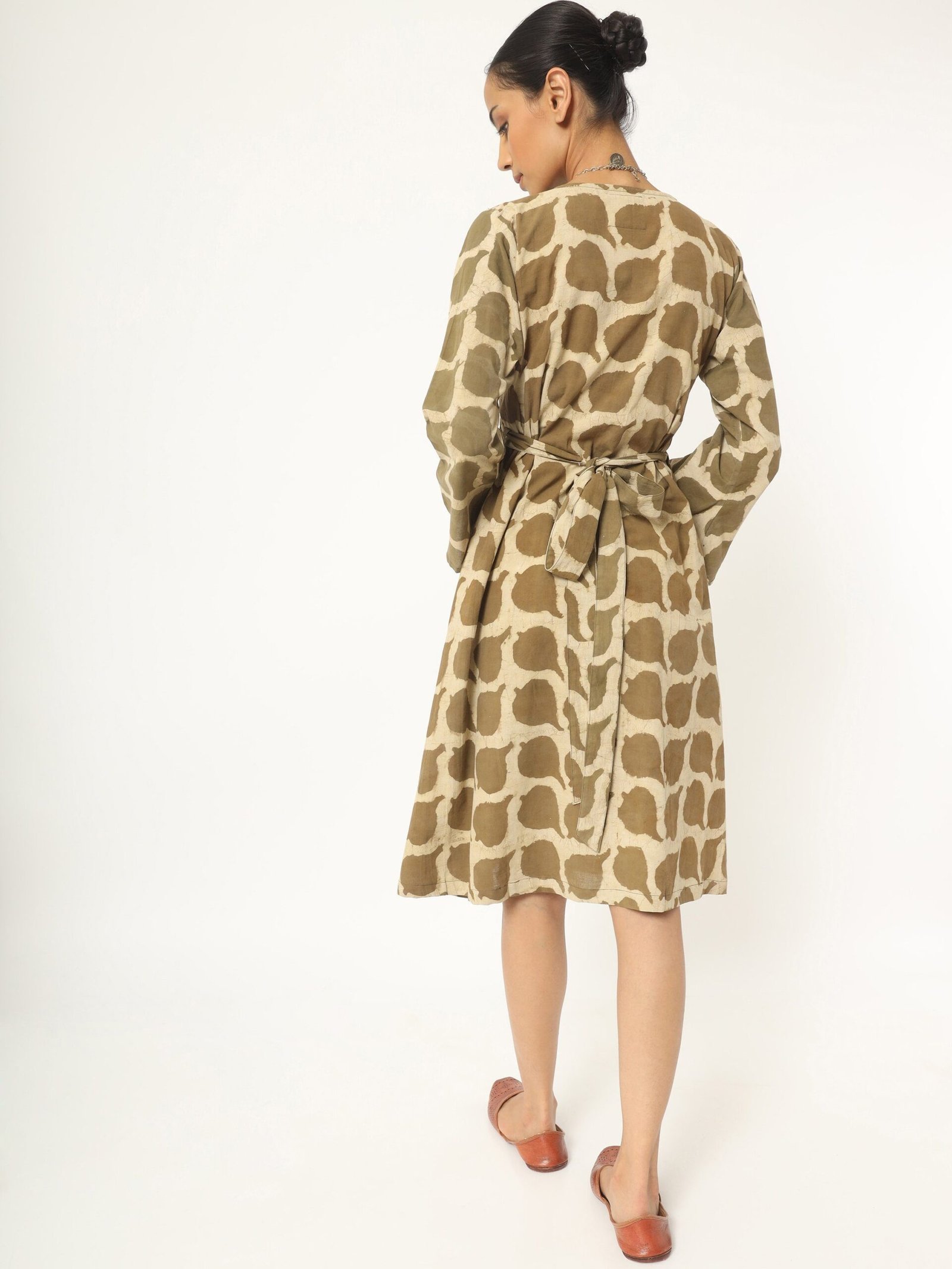 Let the spring breeze follow you wherever you go. In a beautiful hue of Cream and Hena green. our nature inspired Wrap dress is exclusively designed for you. Featuring beautiful block print of leaf motifs. Made with a soft breathable cotton fabric. Versatile dress with endless possibilities. perfect canvas to accessorise?however you like it. The dress has full flared sleeves with backside belt making it more convenient to wear. With the right accessories wear it anywhere anytime.