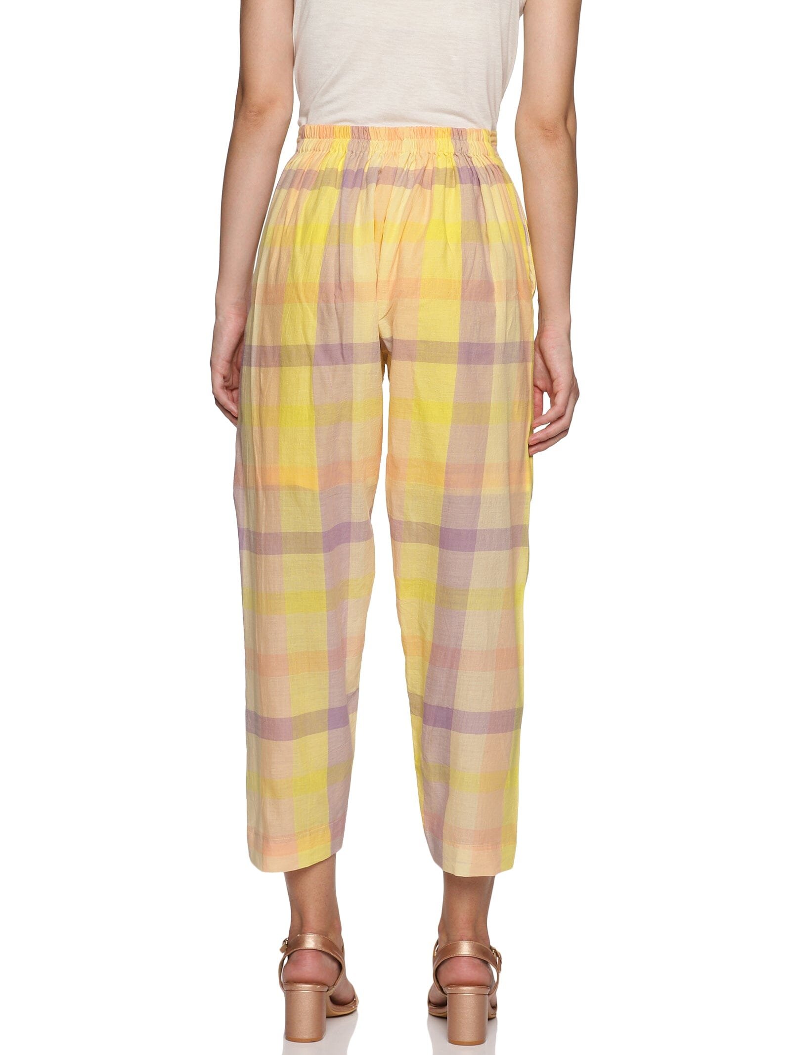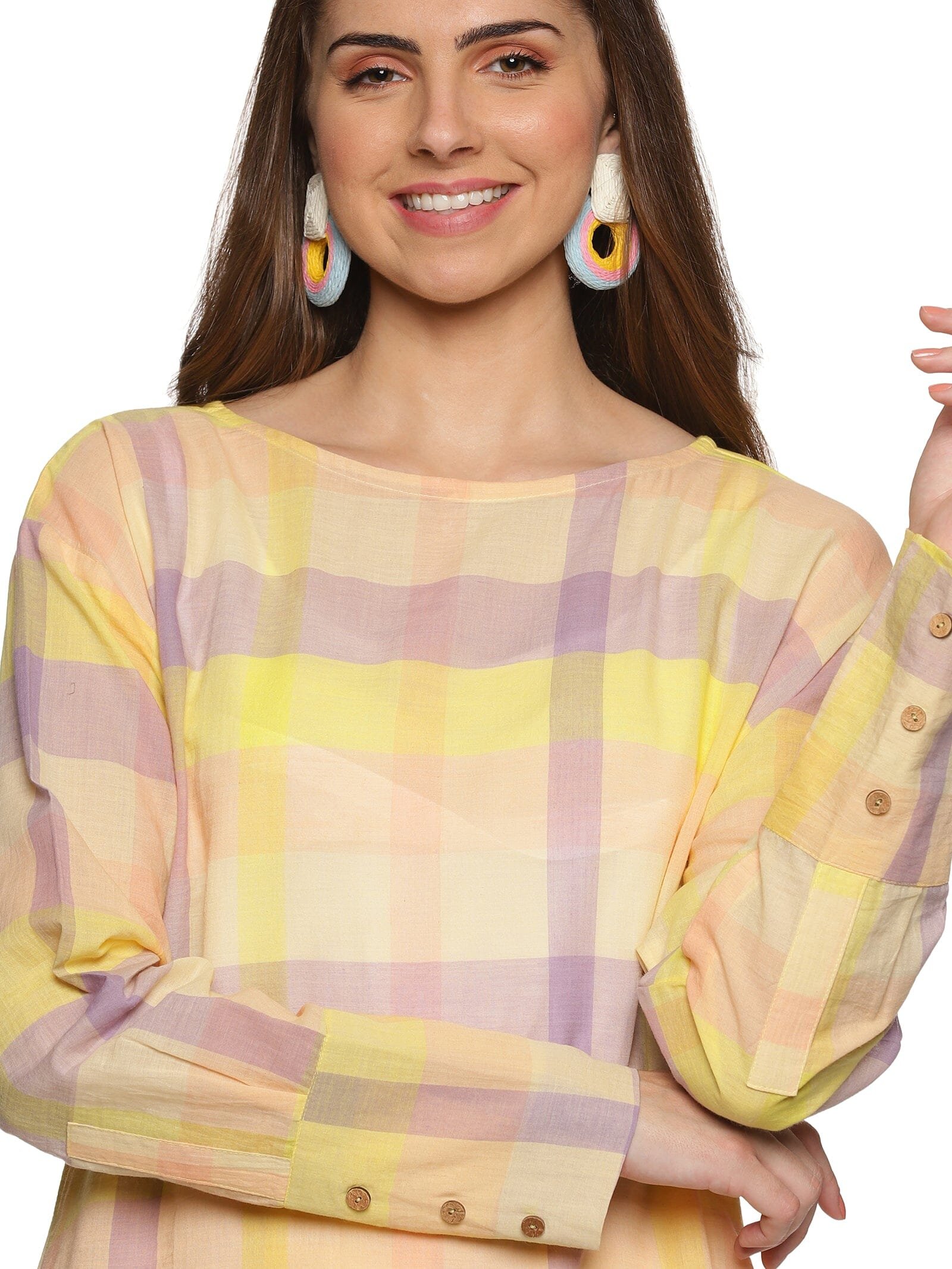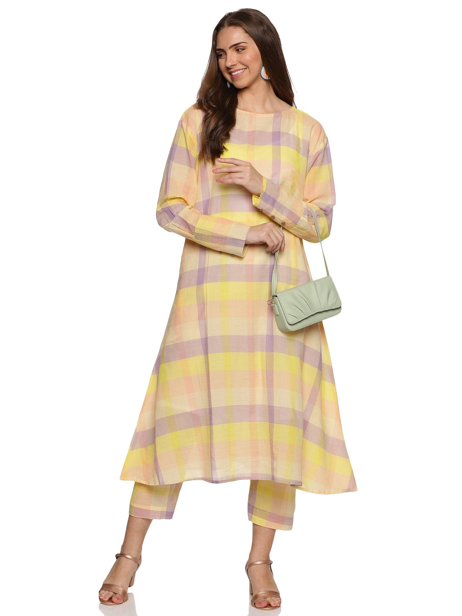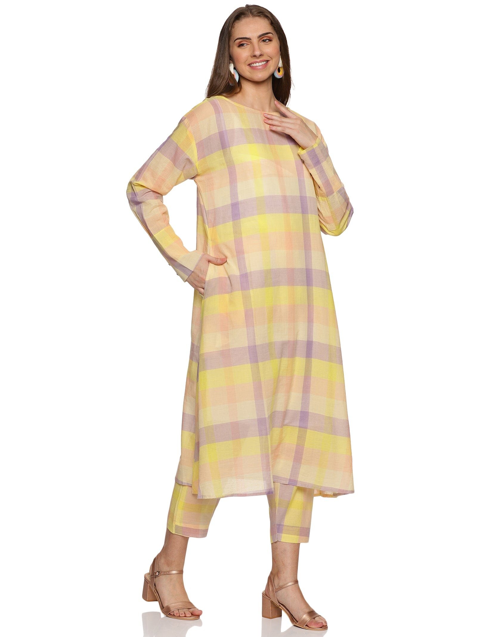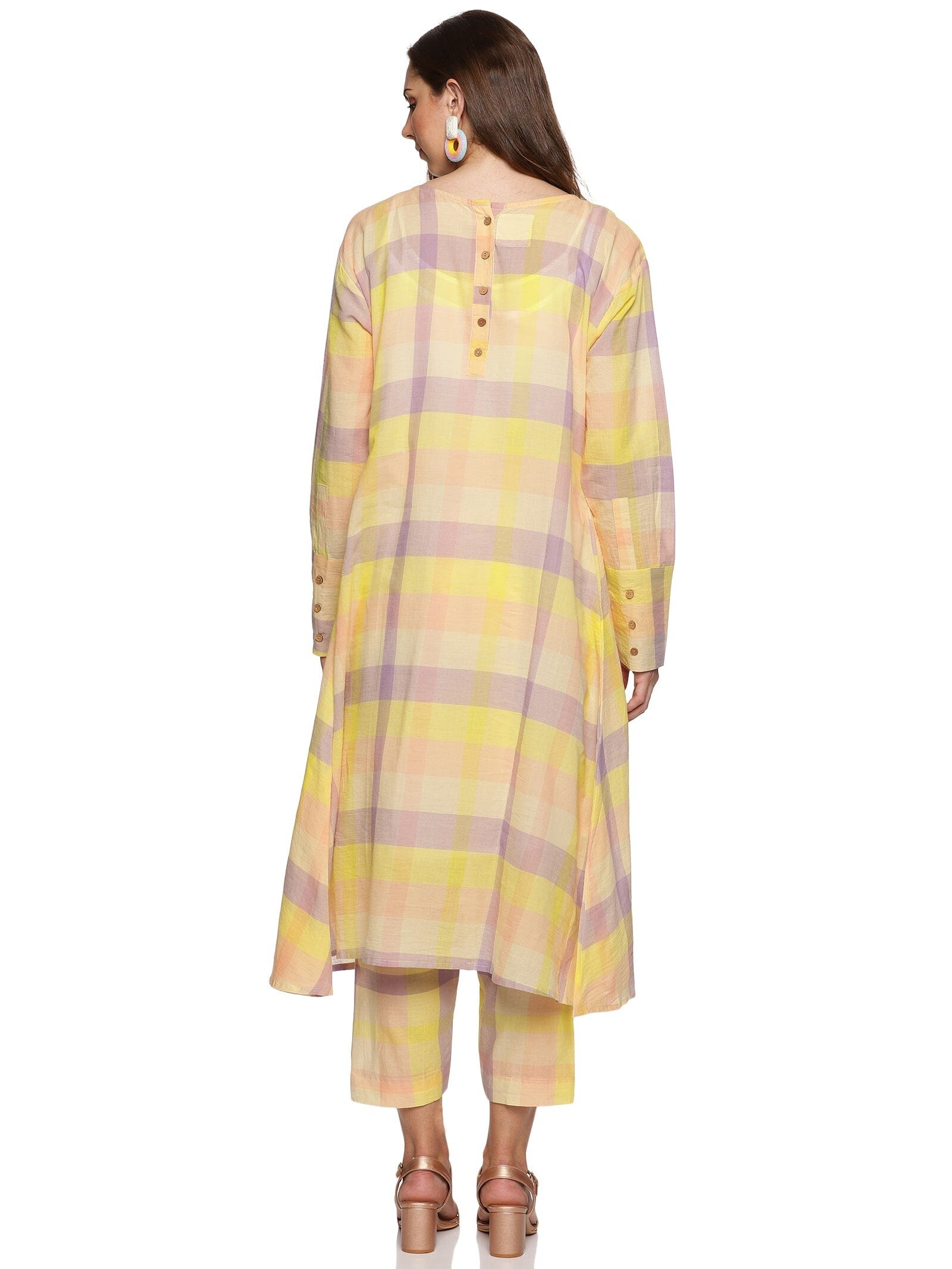 The kurti is in a checked combination of lemon yellow. lavender and peach. giving you a very fresh. bright and elevated look.