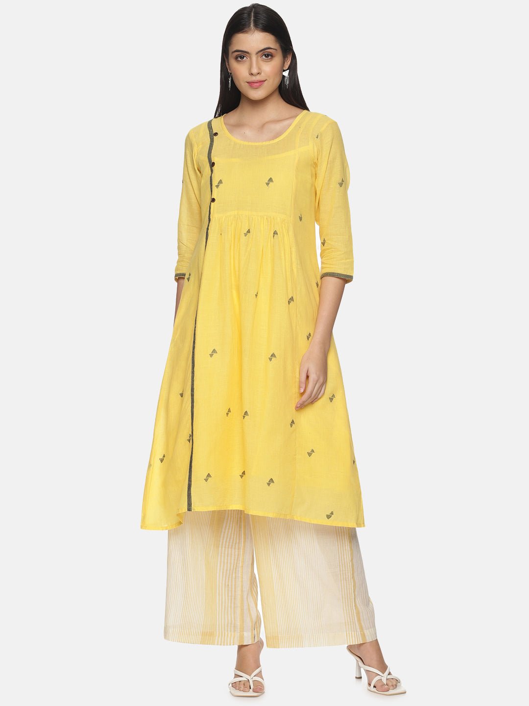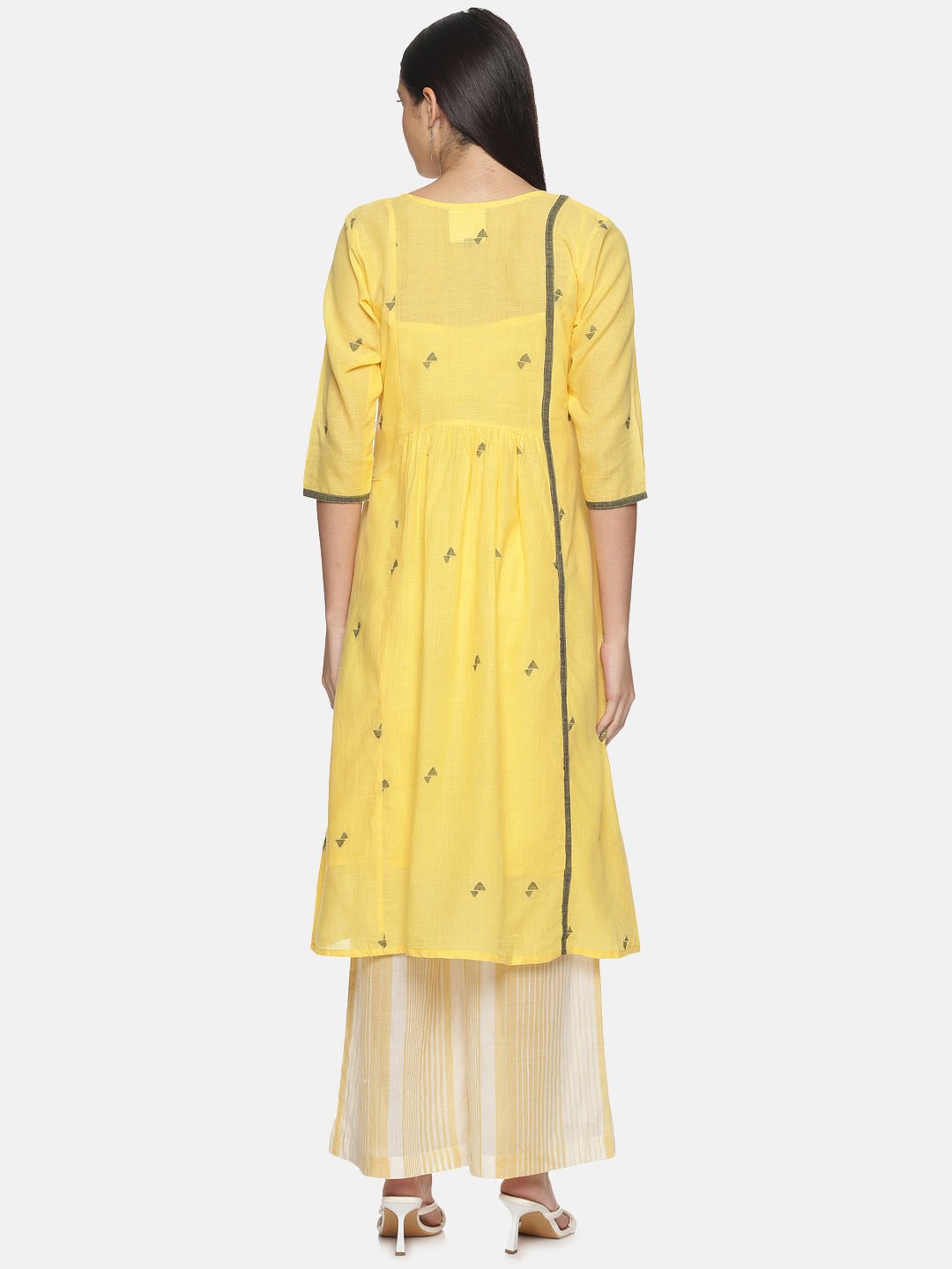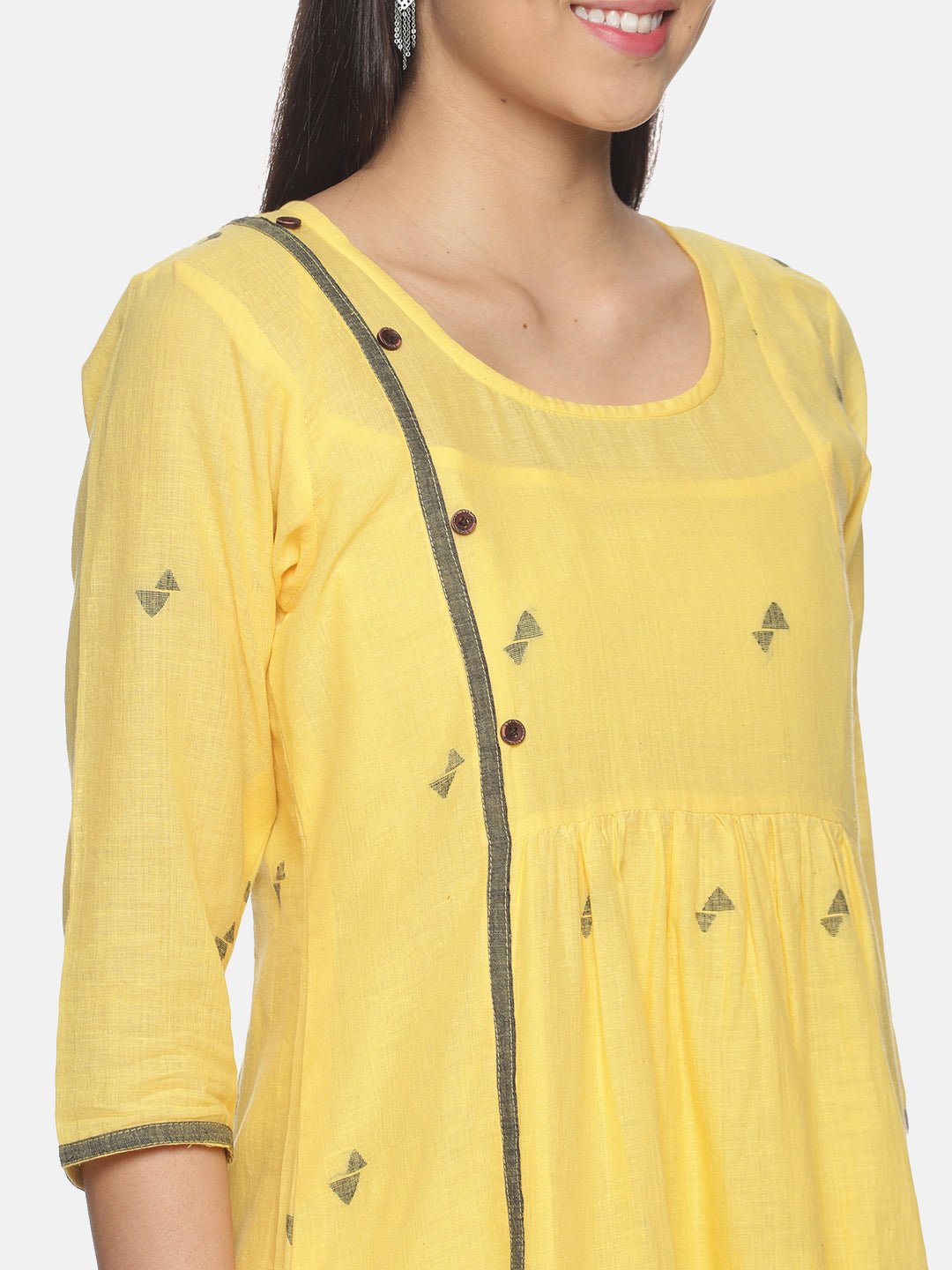 Hand crafted by our very talented team of artisans exclusively for you. It has black jamdani motifs all over the yellow body. finishing off with a thin black border on the sides & hemlines. This dress has a classic round neckline. long three-quarters sleeves and the front plus back both sides have elegant gather. giving it a very classy look and feel.
