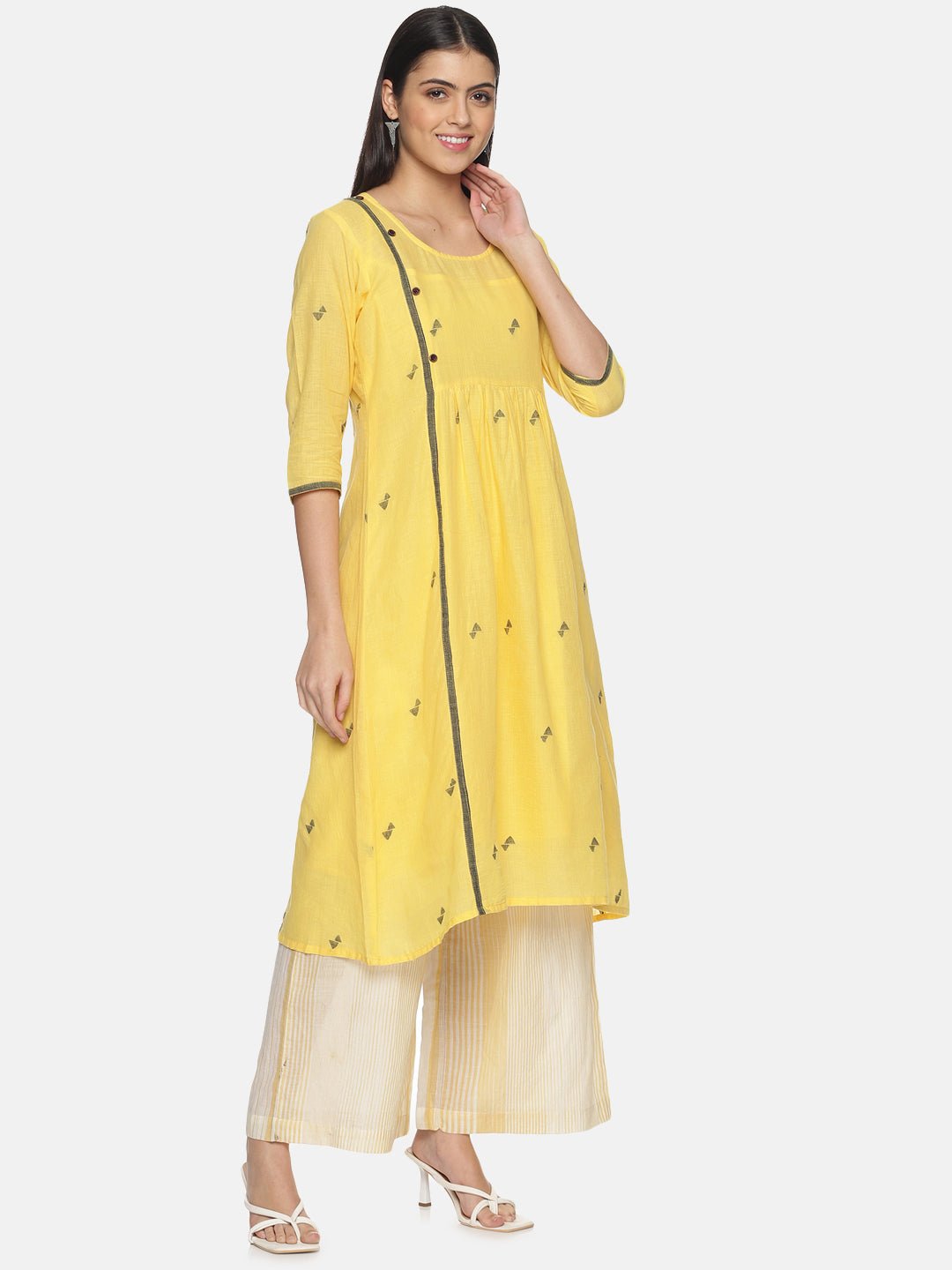 Get ready to glow like a sunflower this festive season with our Bright yellow A-line Jamdani Dress.